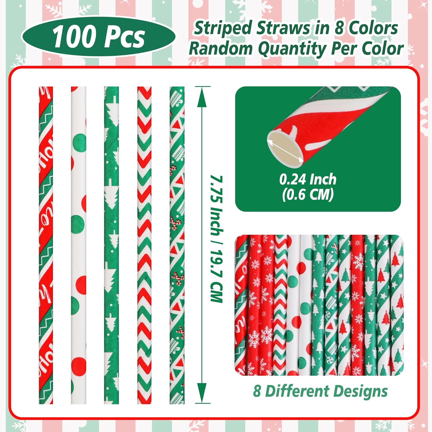 This 100-pack of Christmas-themed paper straws includes 8 different festive designs, featuring red, green, and white colors with snowflakes, Christmas trees, polka dots, stripes, and more. Measuring 7.75 inches (19.7cm) in length and 0.24 inches (0.6cm) in diameter, these straws are perfect for a wide range of beverages such as juice, milk, coffee, cocktails, sodas, and party drinks.