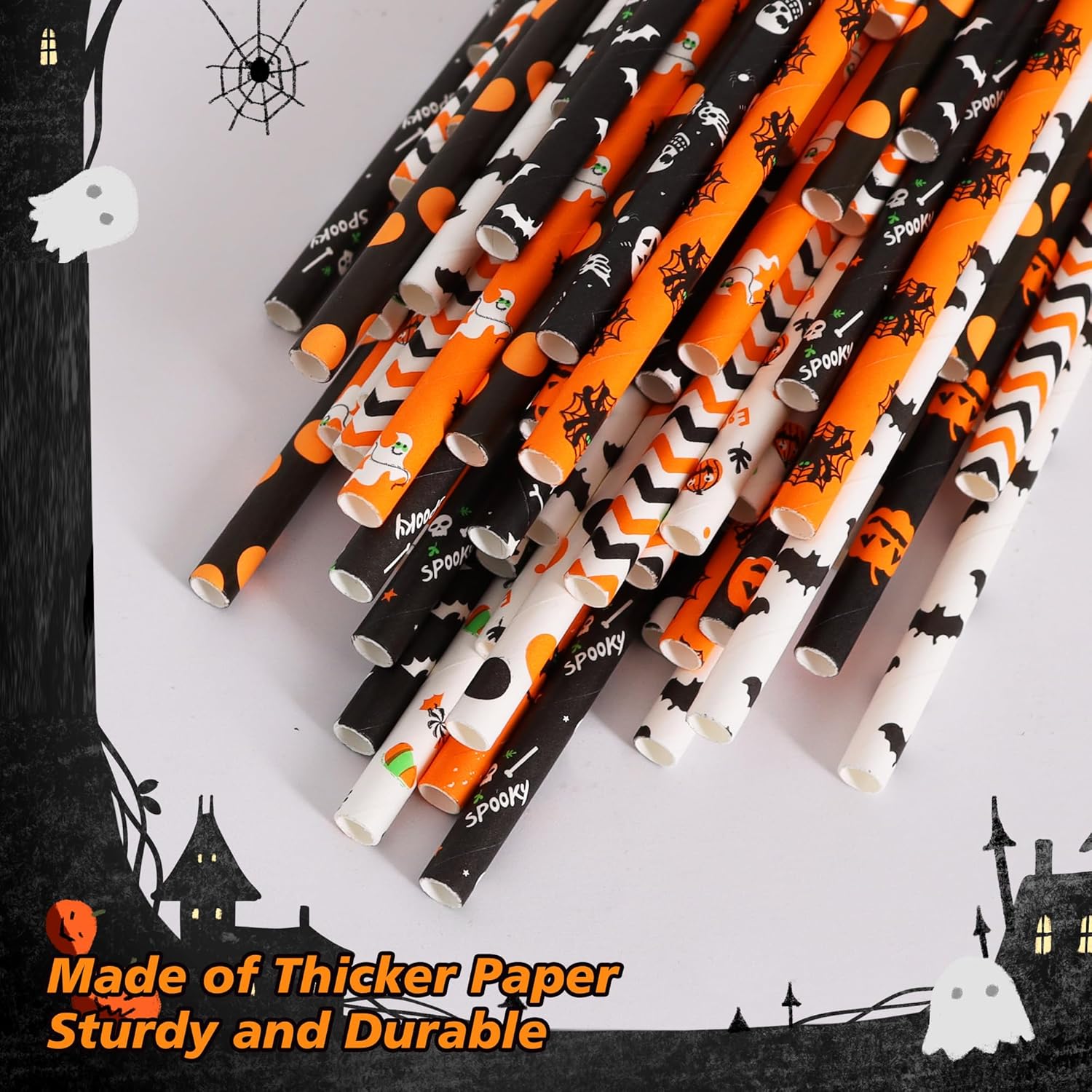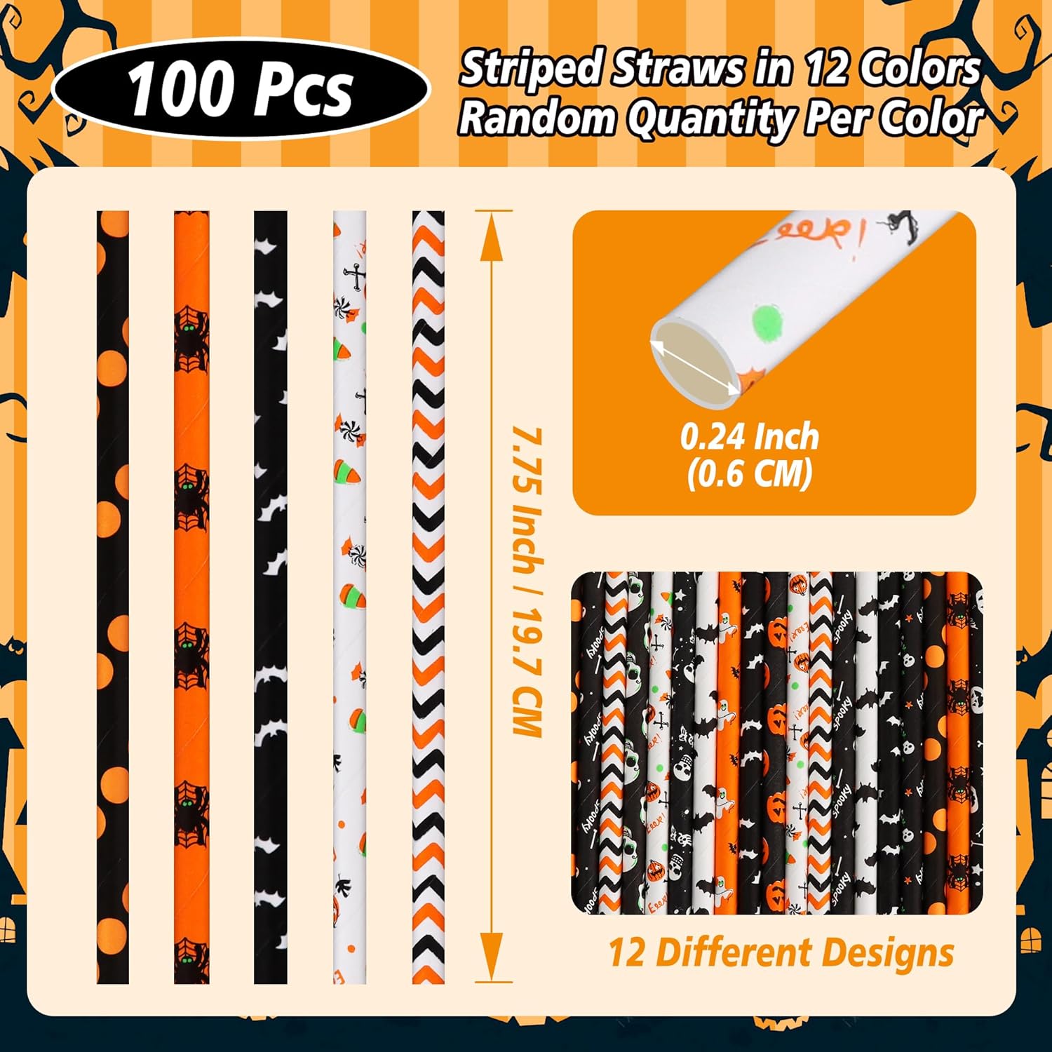 This 100-pack of Halloween-themed paper straws is designed to bring festive spirit to your parties and gatherings. Featuring 12 different Halloween designs in classic black, orange, and white, with patterns including bats, pumpkins, candy, ghosts, stripes, and more, these straws are fun, decorative, and functional. Each straw measures 7.75 inches (19.7cm) in length with a diameter of 0.24 inches (0.6cm), making them suitable for most cups and drinks such as juice, soda, cocktails, and milk.