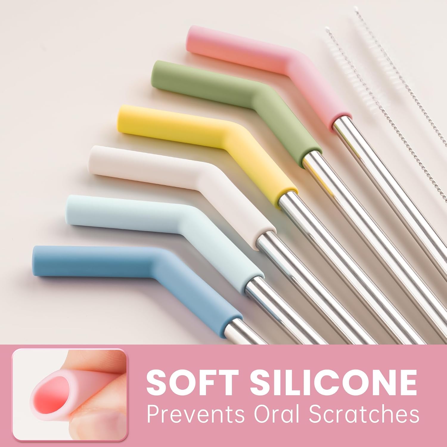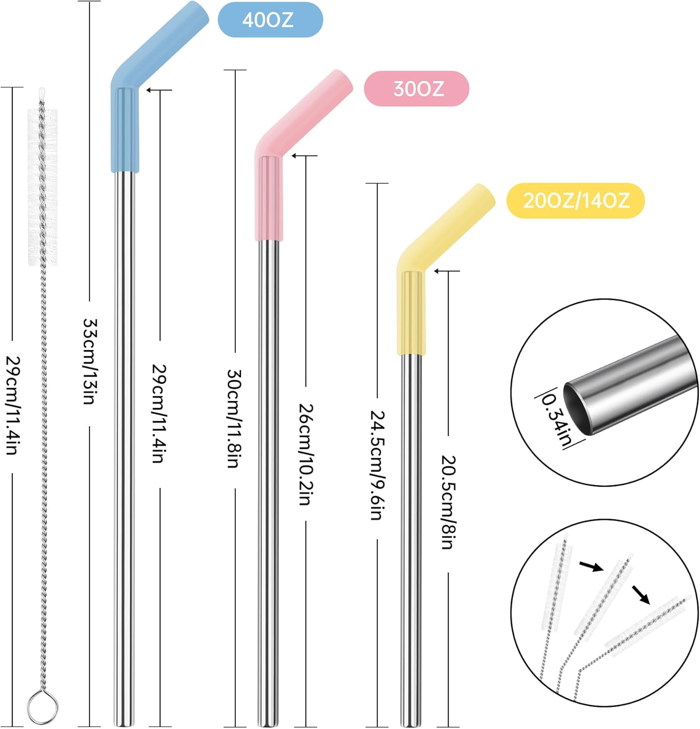 This 6-pack stainless steel straw set includes multiple sizes designed to fit different cup capacities, from 14oz, 20oz, 30oz, to 40oz tumblers. Made of premium 304 stainless steel, these straws are durable, rust-resistant, and reusable, making them an eco-friendly alternative to single-use plastic straws. The set also comes with random-colored silicone tips that protect your teeth and lips from extreme temperatures, adding comfort and style to your drinking experience.